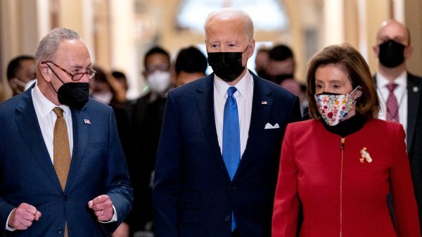 President Joe Biden, center, along with Senate Majority Leader Chuck Schumer, left, and House Speaker Nancy Pelosi at the Capitol on January 6, 2022...