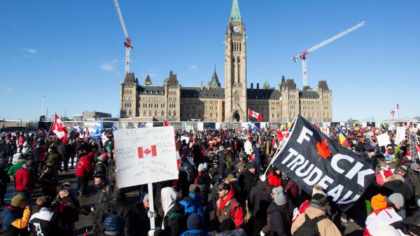 Supporters arrive at Parliament Hill for the Freedom Truck Convoy to protest against Covid-19 vaccine mandates and restrictions in Ottawa, Canada, on January 29,...