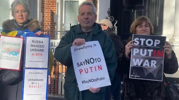 Vlodko Pawluk, center, protesting Russian President Vladimir Putin. Courtesy of Vlodko Pawluk Insider met with a group of worried Ukrainian expats in London. One...