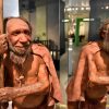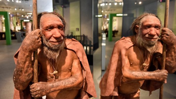 The reconstruction of a Homo neanderthalensis, who lived within Eurasia from circa 400,000 until 40,000 years ago, mirrors at the Neanderthal Museum in Mettmann,...