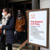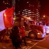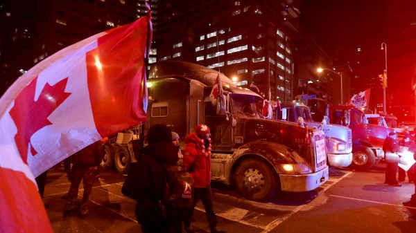 A person walks while holding Canada’s flag in front of parked trucks during a protest by truckers and supporters against coronavirus disease (COVID-19) vaccine...