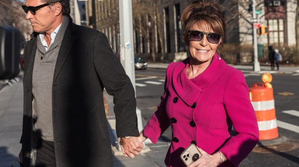 Sarah Palin, 2008 Republican vice presidential candidate and former Alaska governor, arrives with former NHL hockey player Ron Duguay during her defamation lawsuit against...