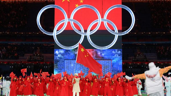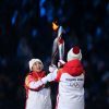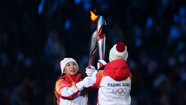 Torch bearers carry the Olympic flame during the opening ceremony of the Beijing 2022 Winter Olympics at the Beijing National Stadium on February 4,...