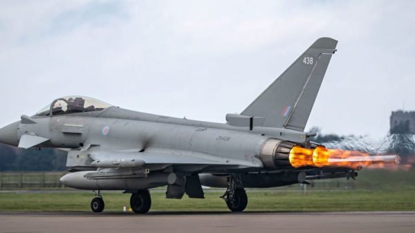 ZK438 Royal Air Force Eurofighter Typhoon FGR4 lights the afterburner for a performance takeoff RAF Coningsby. Jon Hobley/MI News/NurPhoto via Getty Images The Royal...