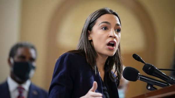 Rep. Alexandria Ocasio-Cortez (D-NY) speaks during a news conference to discuss legislation that would strengthen Social Security benefits, on Capitol Hill October 26, 2021...