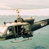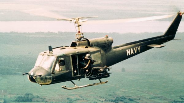 The door gunner in a UH-1B Huey gunship fires on Vietcong positions during a search-and-destroy mission in the Mekong Delta, January 23, 1968. Bettmann/Getty...