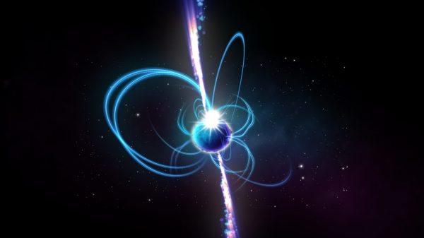 An artist’s impression of what the object might look like if it’s a magnetar, with powerful magnetic fields. ICRAR Astronomers found a spinning object...