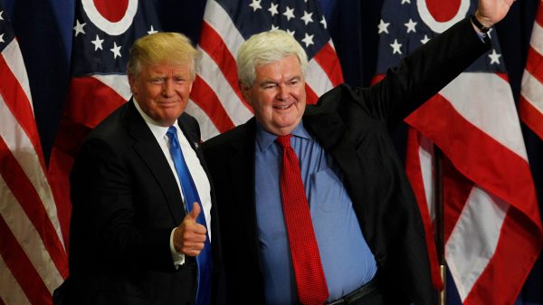 Former House Speaker Newt Gingrich introduces then-Republican presidential candidate Donald Trump during a rally at the Sharonville Convention Center on July 6, 2016, in...