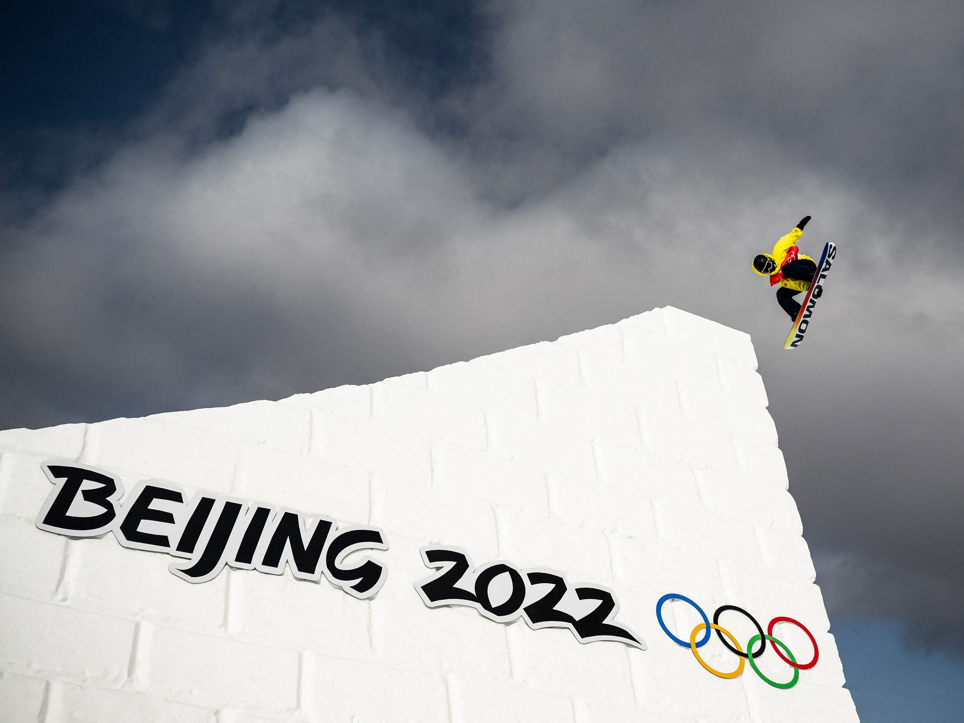An athlete takes part in a snowboard slopestyle practice session at Genting Snow Park in Zhangjiakou on Feb. 3, 2022, ahead of the Beijing 2022 Winter Olympic Games.