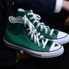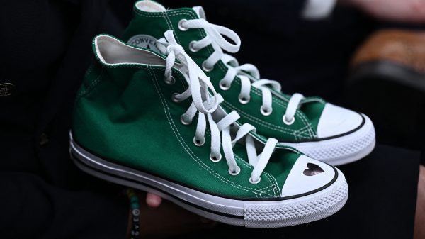 The pair of green Converse high-tops worn by nine-year-old Maite Rodriguez when she was killed in the Uvalde school shooting. BRENDAN SMIALOWSKI/AFP via Getty...