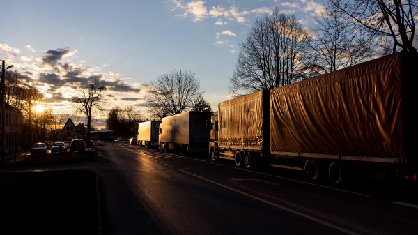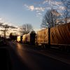 A line of trucks en route to a border crossing point seen in Kybartai, Lithuania, on Saturday. Paulius Peleckis/Getty Images Hundreds of Russian and...