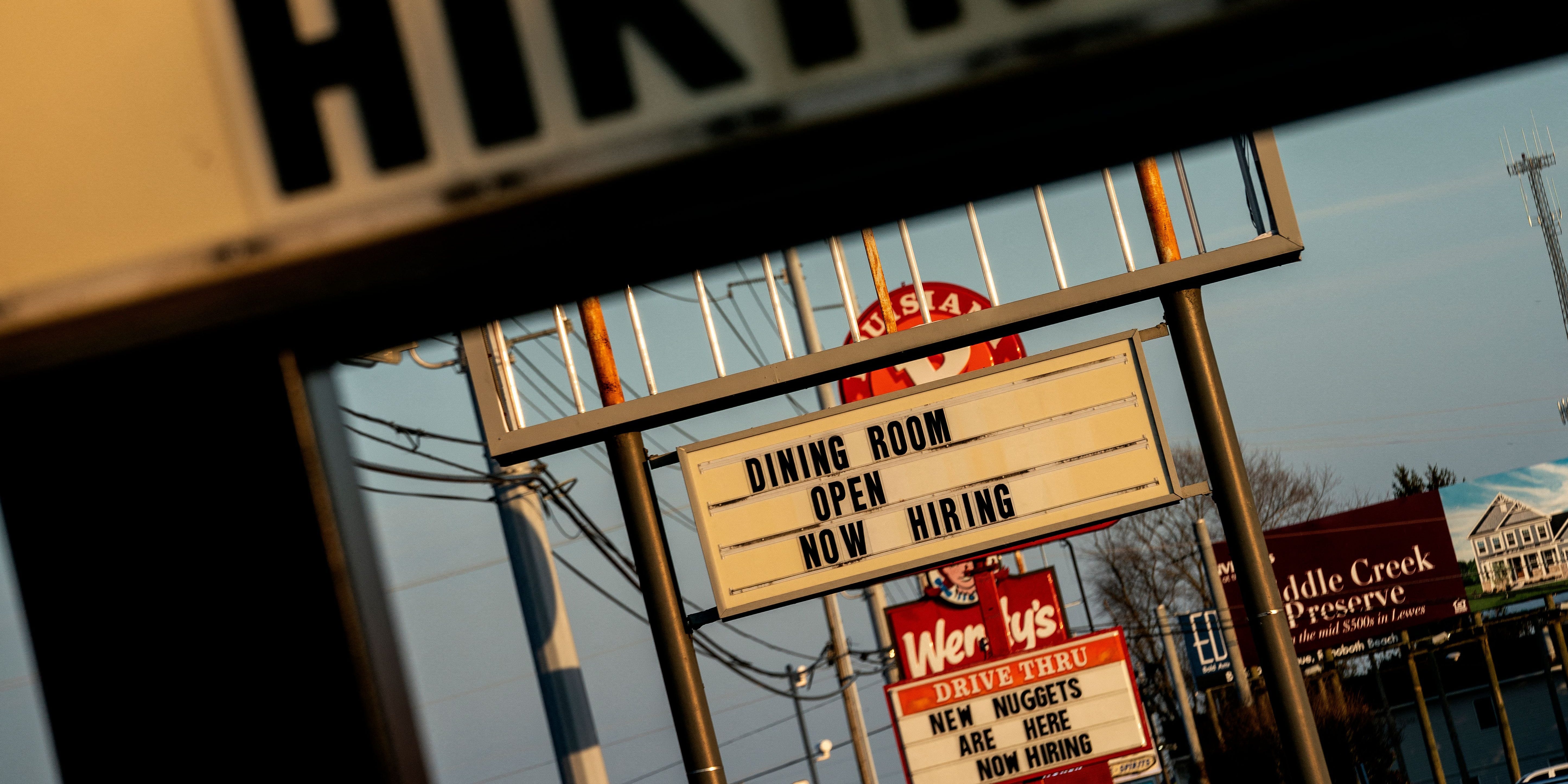 Now Hiring signs are displayed in front of restaurants in Rehoboth Beach, Delaware, on March 19, 2022.
